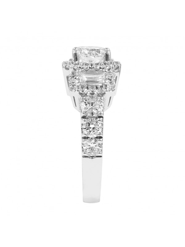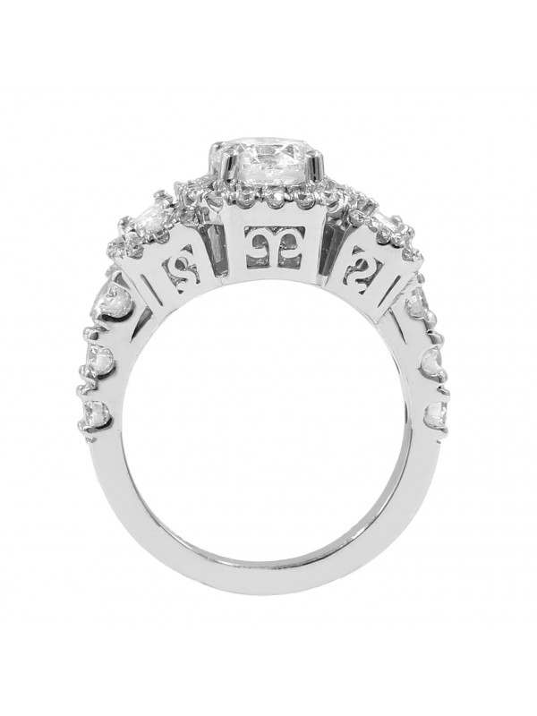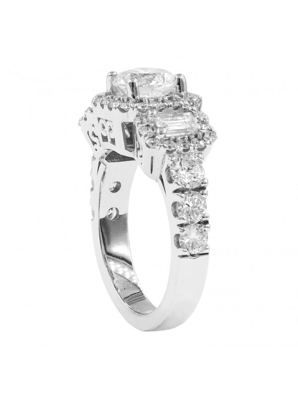 Stand out with this 14K White Gold, Halo Diamond Ring in size 6.5. This beautiful diamond ring features halo around three major stones. The two emerald cut diamonds are prong set to the side of a 1.31 carat round brilliant cut center diamond. There are three stones going down each side of the ring, as well as swirl designs cut to the side of the ring to give it a special touch.