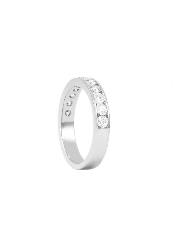 This beautiful diamond ring has 11 diamonds that run through the middle in a channel setting.