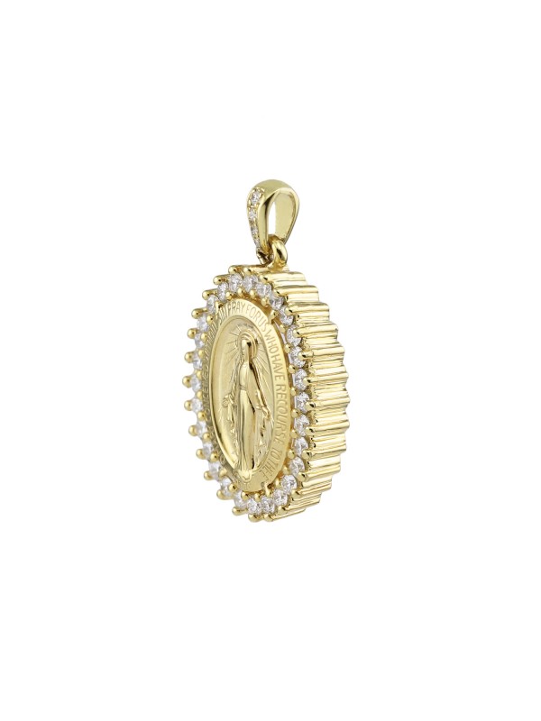 You are viewing a 14K Yellow Gold Diamond Miraculous Medal Pendant. This pendant has 32 round cut diamonds, that is prong set around the frame & bail. The dimension of this pendant is 31 x 19.42 mm.