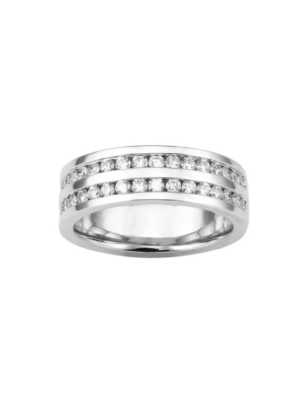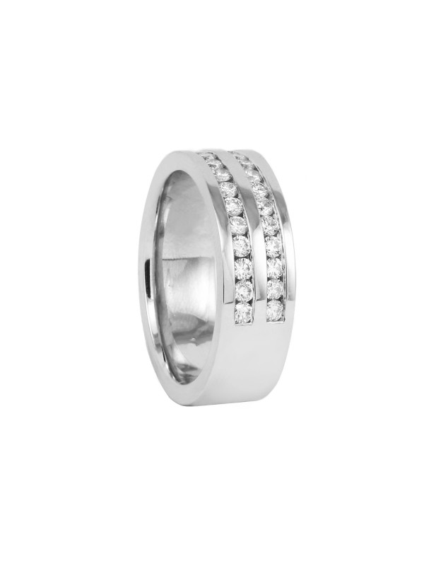 This ring has 34 Round Cut Diamonds that are channel set between rows of high polished metal.