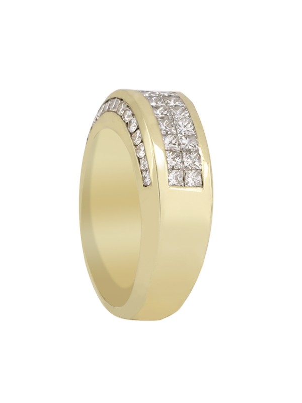 This ring has 60 Princess and Round Cut diamonds set on the top and side of the band in a channel and invisible setting.
