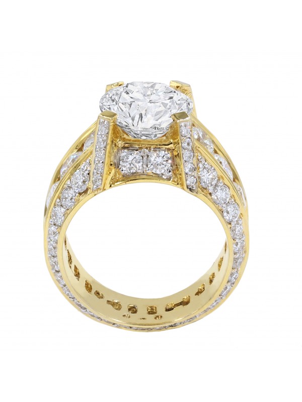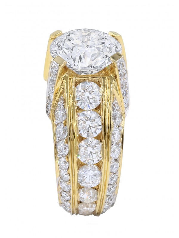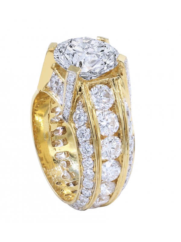 This beautiful 14K yellow gold diamond ring is made for the perfect gentlemen. It has 4.80 carats of round cut diamonds that is pave and channel set around the band and prongs. This beautiful ring has a 4.11ct round brilliant cut diamond sitting on the top of the ring.