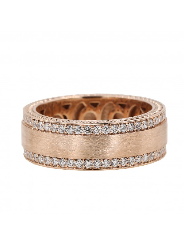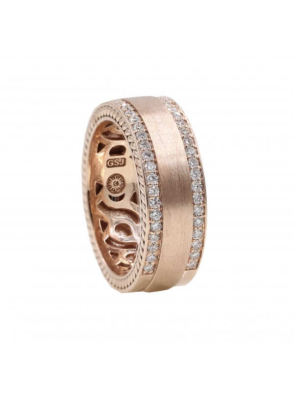 This beautiful gents band has two rows of diamonds that add an extra touch to the brushed rose gold texture of this piece. This band has a total carat weight of .66 and is made of 10KT rose gold. This ring is 9.30 mm in width. Stop in our showroom and check out this incredible piece!
